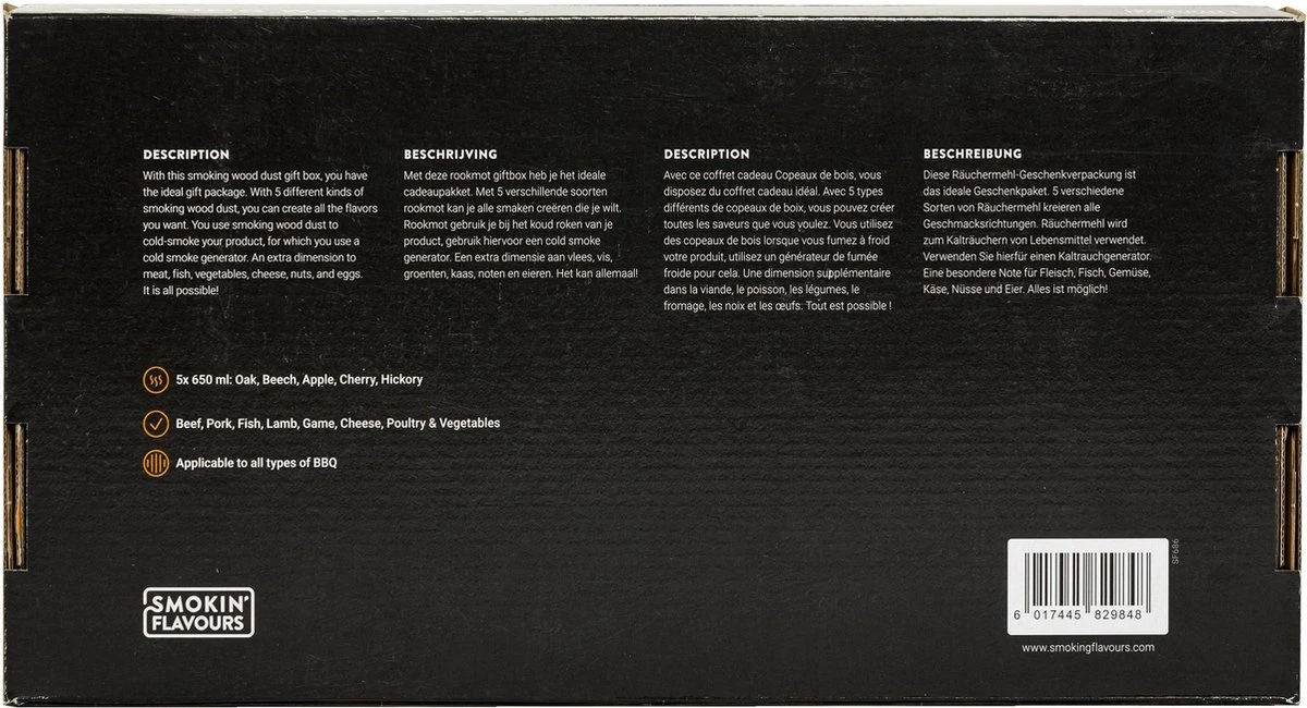 Met deze rookmot giftbox heb je het ideale cadeaupakket. Met 5 verschillende soorten rookmot kan je alle smaken creëren die je wilt. Rookmot gebruik je bij het koud roken van je product, gebruik hiervoor een cold smoke generator. Een extra dimensie aan vlees, vis, groenten, kaas, noten en eieren. Het kan allemaal!